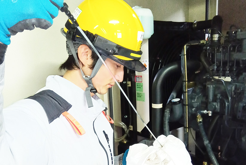 当社では、公共施設・民間問わず非常用発電機の設置を行っています。普段は目立たない設備ですが、災害時などに人々の暮らしを支える重要な役割を担っています。そうした設備の保守・点検に携わることに、大きな責任とやりがいを感じています。